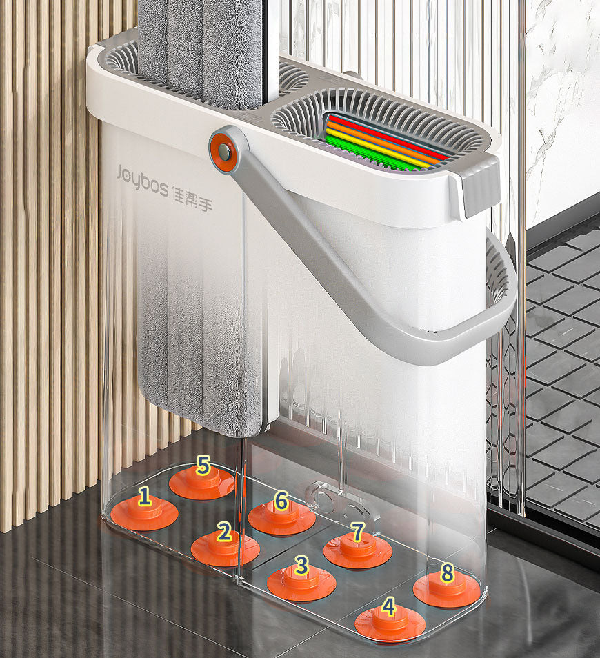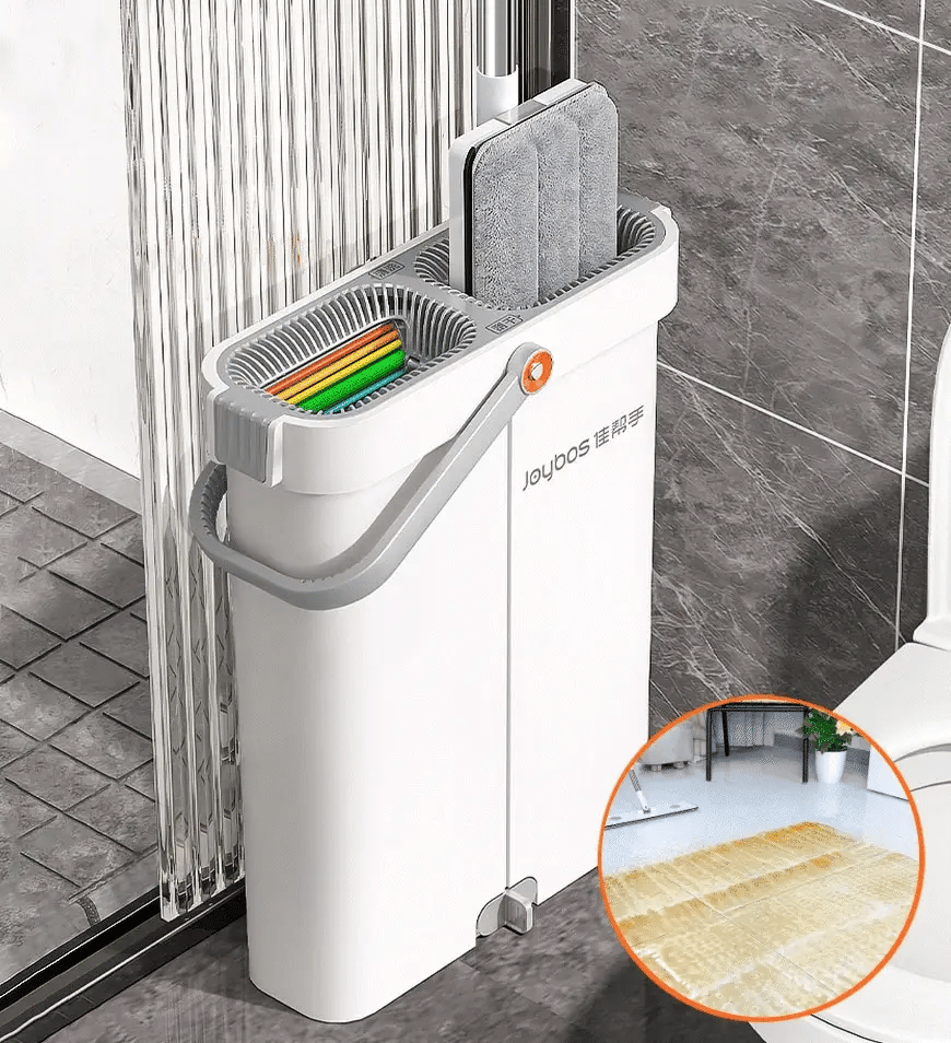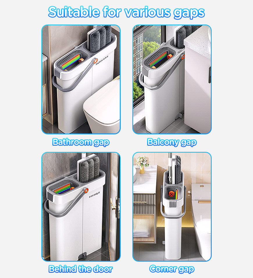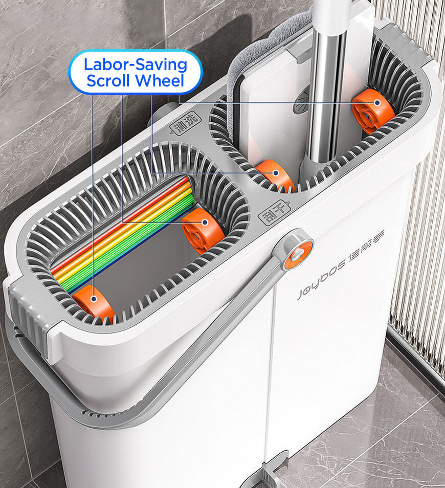- All-IN-ONE Flat Mop and Bucket System, 2 separate chambers in bucket for washing and drying, scraper blade in WASH to scratch away any dirt,hair or dust, scraper blade in DRY to squeeze extra water, no water left after moping.